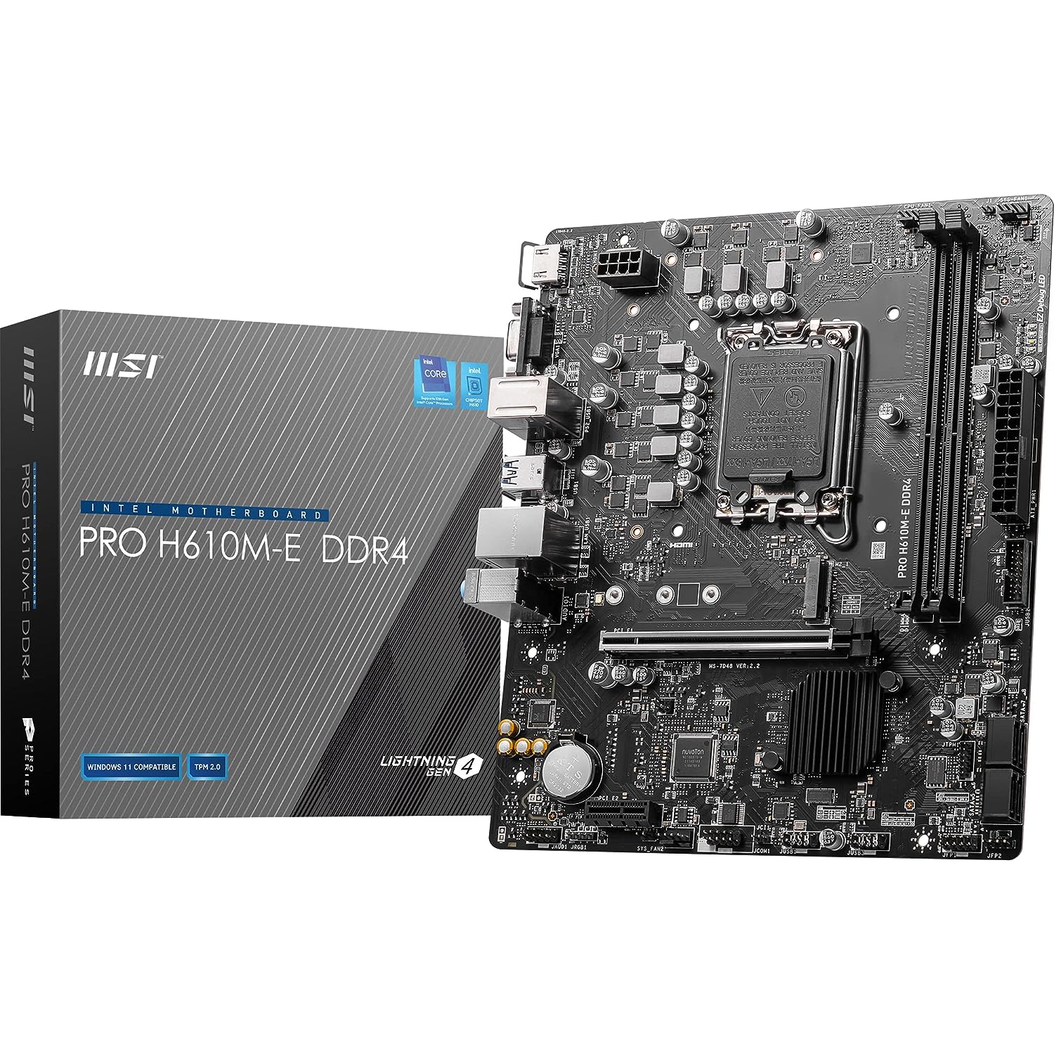 MSI PRO H610M-E DDR4 Motherboard, Micro-ATX – Supports Intel 12th Gen Core Processors, LGA 1700 x DIMMs (3200MHz), 1x PCIe 4.0 x16 Slot, 1 x M.2 Gen3, USB 3.2 Gen1, 1G LAN